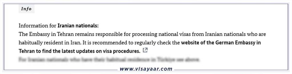 کدام کنسولگری مسئول بررسی درخواست ویزای ایرانیان است؟در حال حاضر، درخواست ویزای ملی برای اتباع غیرترک تنها از کنسولگری آلمان در استانبول امکان‌پذیر است.